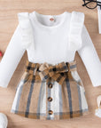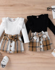 Name: Knitted Ribbed Solid Color Tops + Plaid Skirt